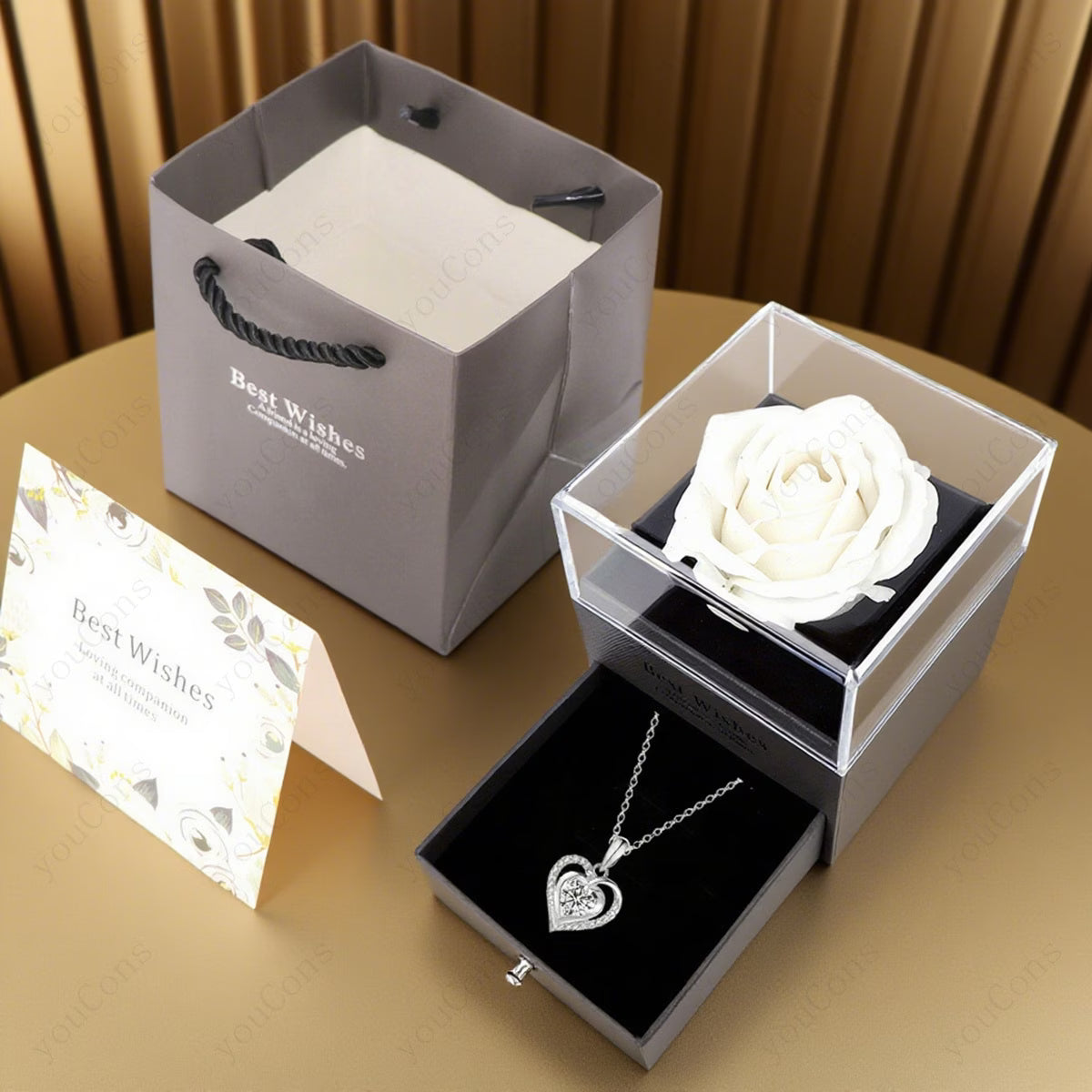 Set Cadou Romantic – Trandafiri Albi cu Colier Inimă din Piatră Norocoasă